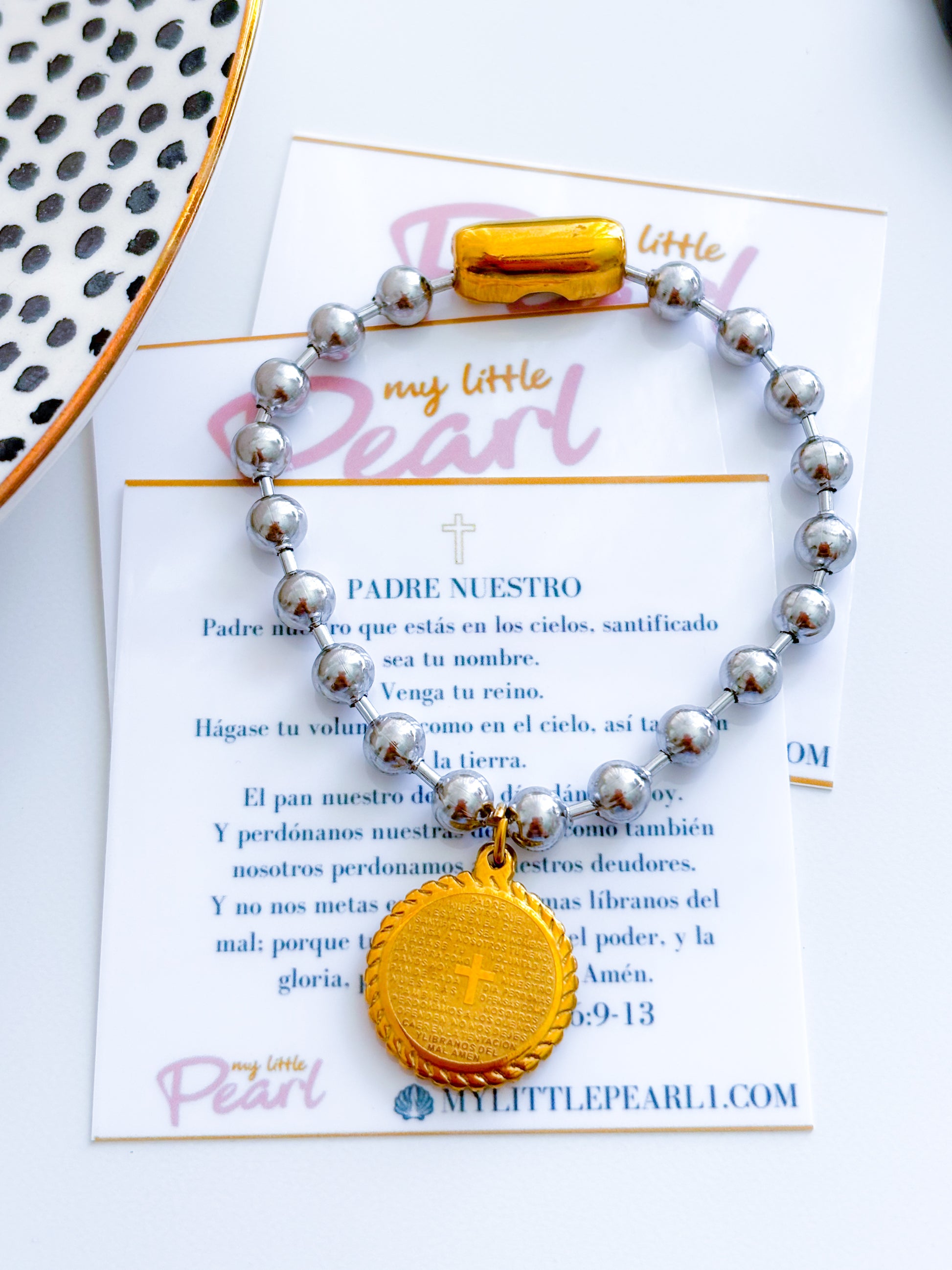 ✨ pulsera en stainless steel con dije grabado con la oración del Padre Nuestro, un recordatorio de fe y protección que puedes llevar siempre contigo.