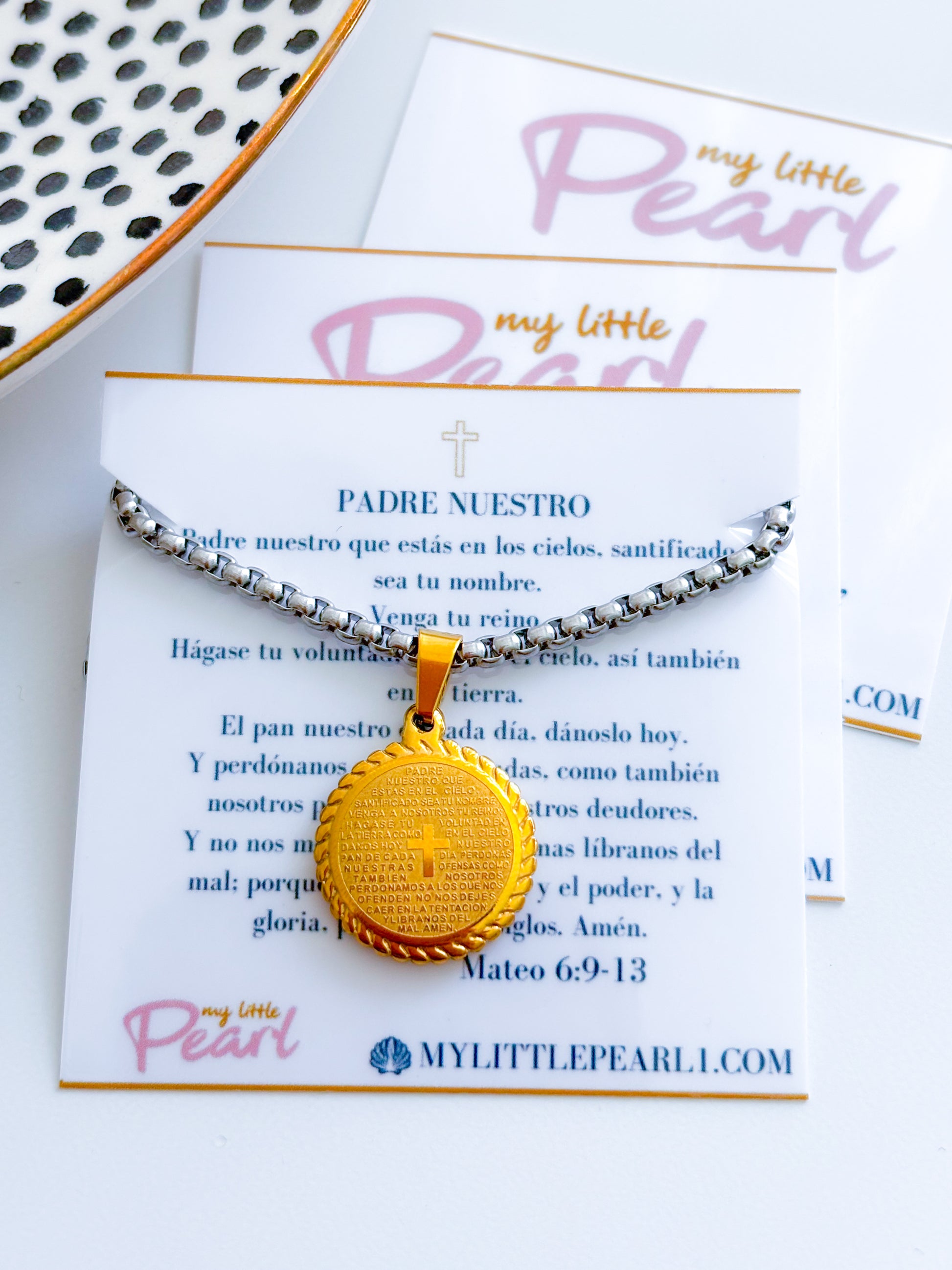 ✨ Collar en stainless steel con dije grabado con la oración del Padre Nuestro, un recordatorio de fe y protección que puedes llevar siempre contigo.